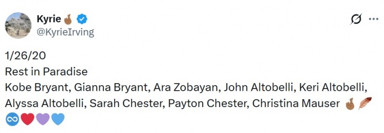 今天,独行侠球星欧文更推道:“1/26/20,愿天堂安息,科比·布莱恩特、吉安娜·布莱恩特、Ara Zobayan, John Altobelli, Keri Altobelli, Alyssa Altobelli, Sarah Chester, Payton Chester, Christina Mauser🤞🏾🪶。”